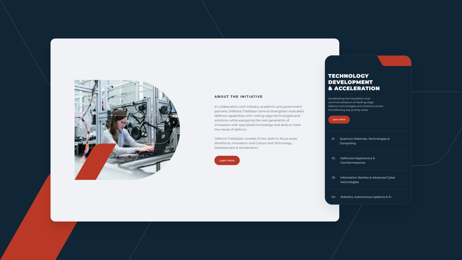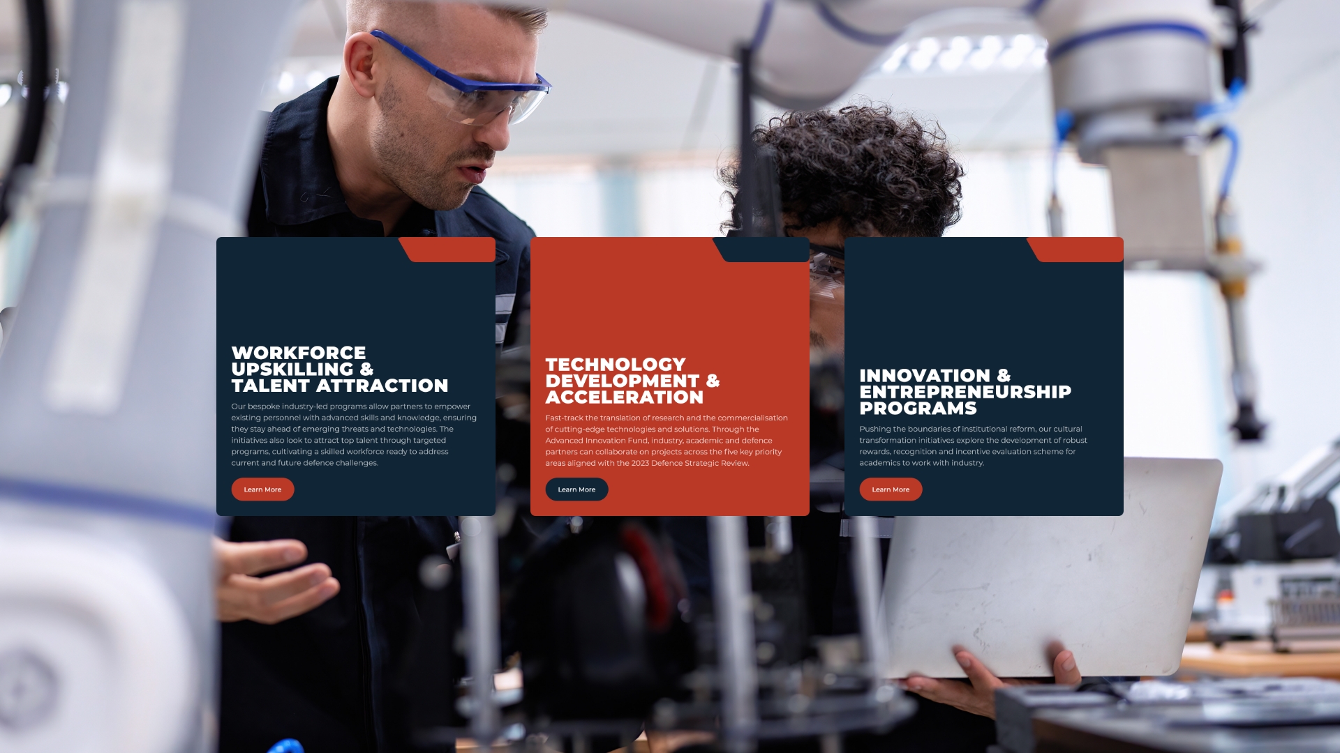 The challenge was building a website that could speak credibly to all these audiences while remaining accessible: researchers need to find collaboration opportunities, startups need innovation pathways, and established defence contractors need partnership information.